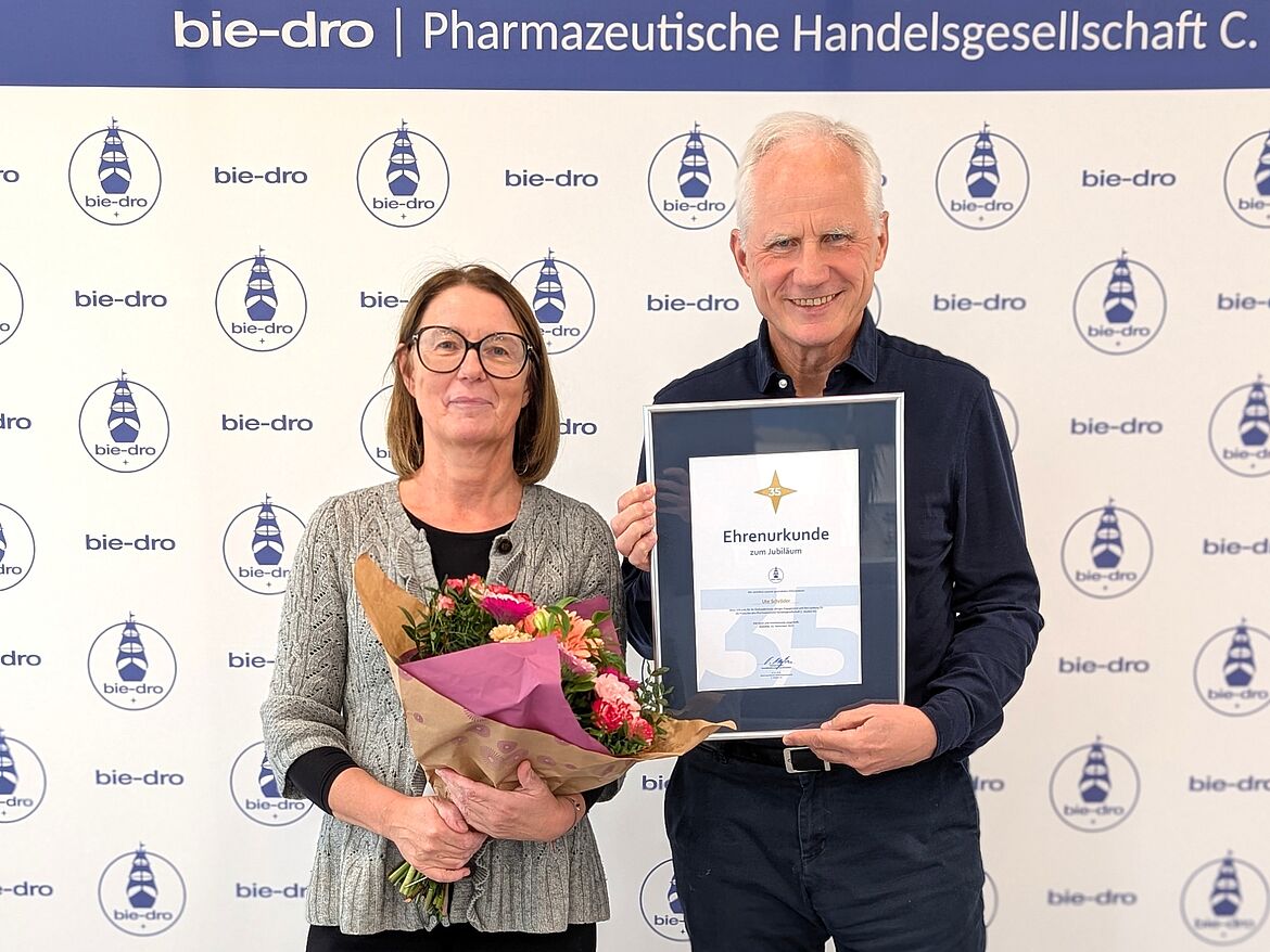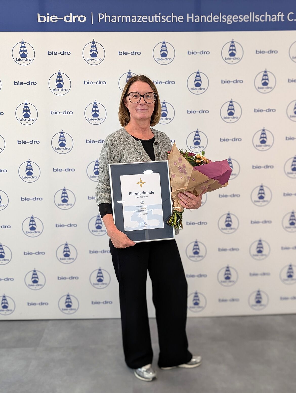 Wir gratulieren unserer Mitarbeiterin Frau Schröder, herzlich zum 35-jährigen Firmenjubiläum! Von der Auftragsannahme bis zum heutigen Doppelposten (Lagerleitung und Asisstenz der Geschäftsleitung) hat Frau Schröder einen beeindruckenden Weg in unserem Unternehmen zurückgelegt. Wir danken für diese außergewöhnliche Loyalität und die immense Fachkompetenz – in Prozessen, Warenkunde, Detailabläufen unseres Unternehmens – und der wichtigen Kommunikation mit Kunden und Lieferanten. Wir freuen uns auf viele weitere gemeinsame Jahre und die spannenden Veränderungen, die vor uns liegen!