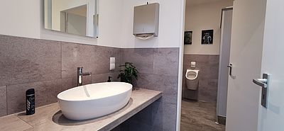 auf dem Herren und Damen WC durchaus sehen lassen. Angenehmes Licht, eine Abluftanlage und stylische Fliesen sorgen für ein schönes "WC Feeling".